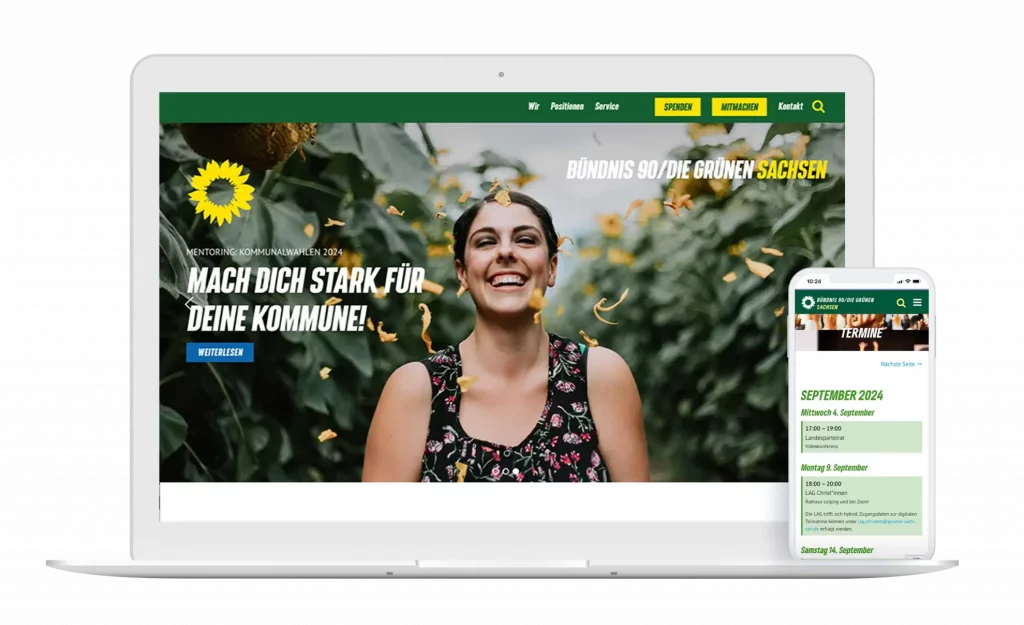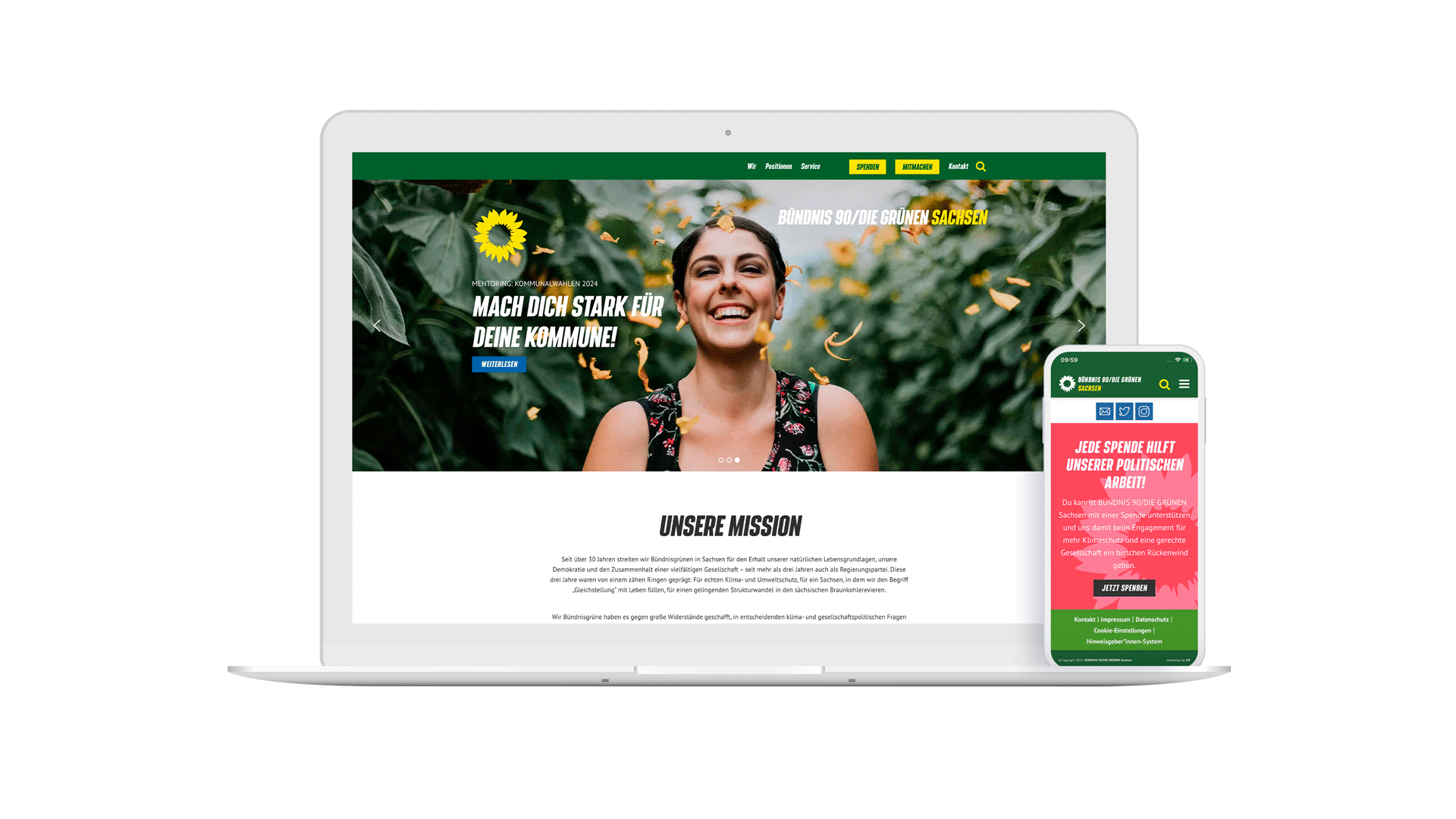Der Onlineauftritt der Partei „Bündnis 90/Die Grünen Sachsen“ hat ein komplett neues Design bekommen. Der Gedanke „mobile first“ stand hierbei im Mittelpunkt und spiegelt sich in einem modernen, einfachen und gut strukturiertem UX-Design wieder.